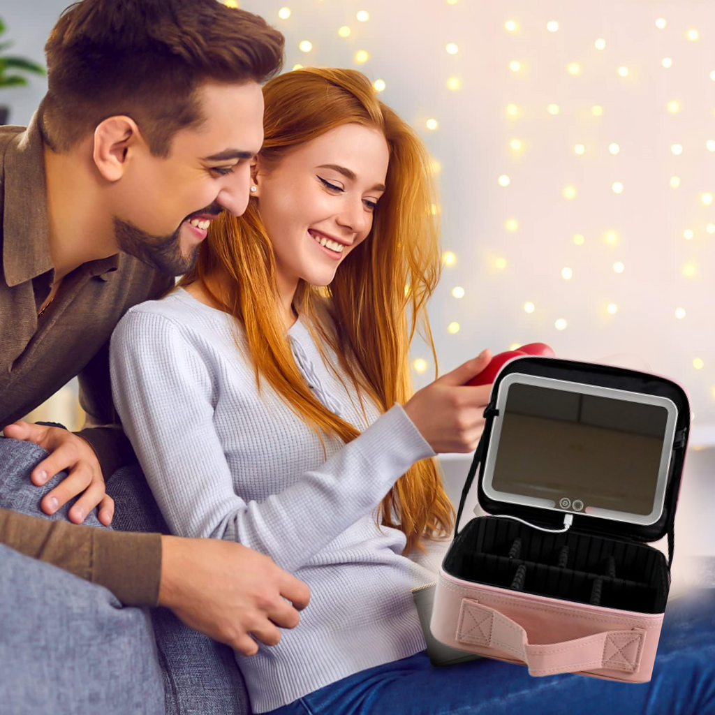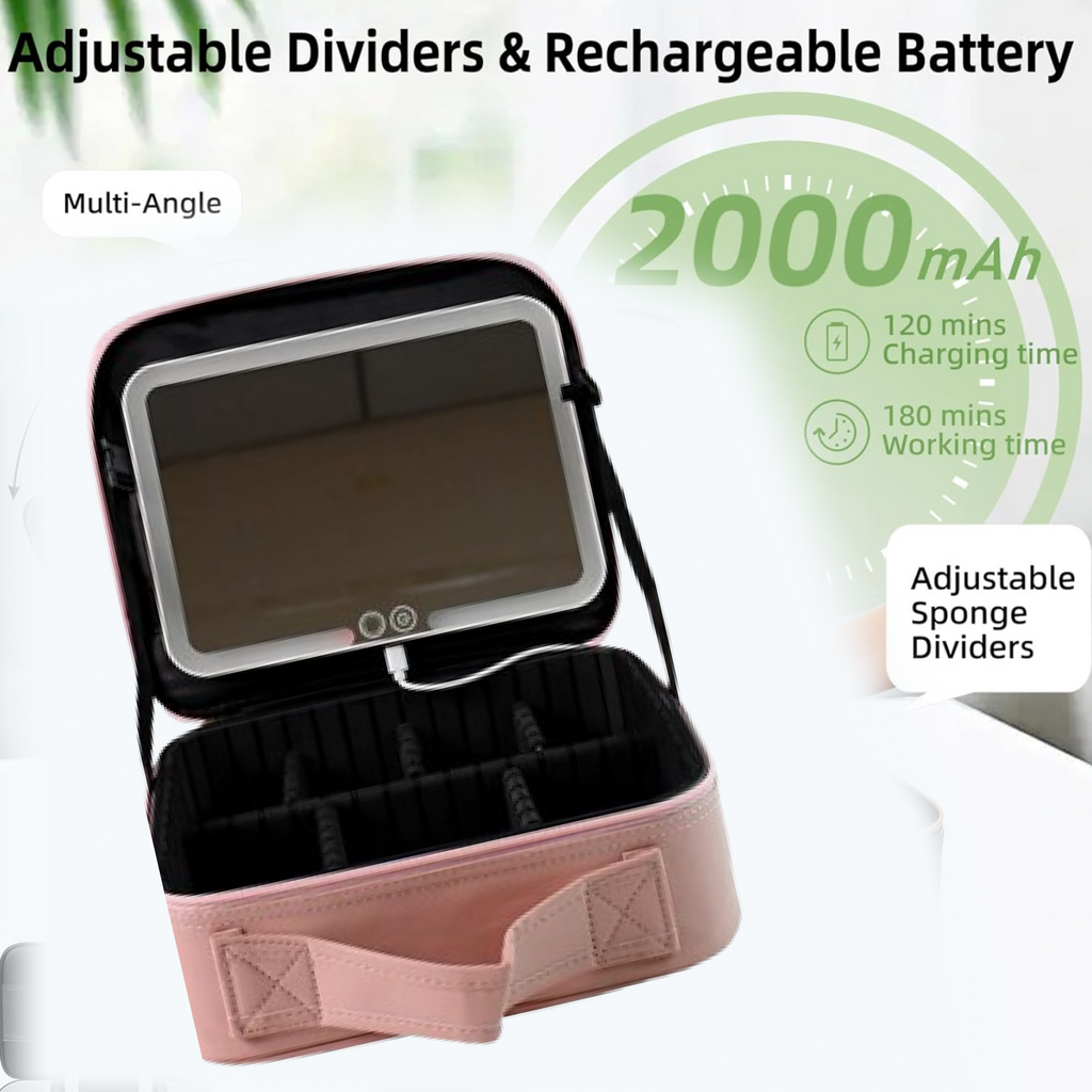 This LED light makeup organizer box is the ultimate blend of utility and elegance. Crafted for makeup enthusiasts and frequent travelers, it features a large storage compartment with adjustable dividers to neatly organize cosmetics, skincare bottles, and beauty tools. The built-in rectangular touch sensor mirror with LED lighting provides optimal brightness for precision makeup, even in dim surroundings. A transparent zippered pouch under the lid keeps brushes and slim accessories safe and accessible. Its sleek design and USB rechargeable mirror make it a must-have for on-the-go beauty routines.