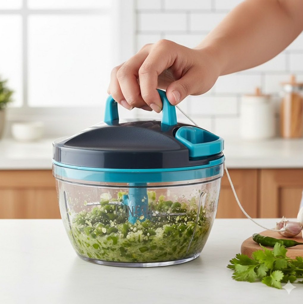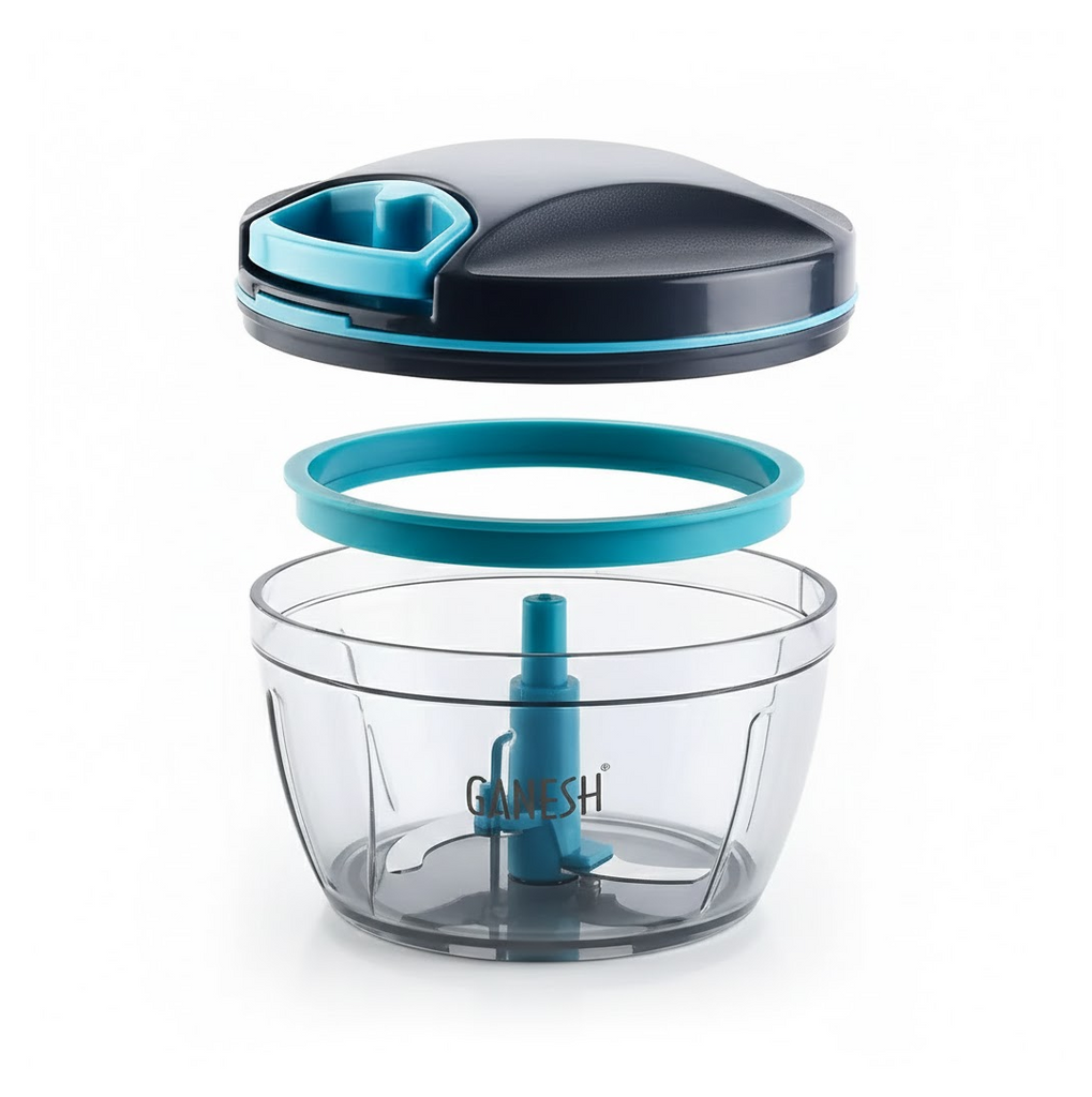 GANESH Wonder Chopper is Ideal for chopping and cutting onion, vegetables, dry fruits, nuts, herbs, etc. It has Sturdy Stainless Steel Blades for quick and efficient chopping. It provide Tear Free Chopping for Onions, Garlic, Chilly, Etc. Make it instant-Paste, Chopping, Gravy, Salad, Chutney, Food Preparations, etc. using Wonder Chopper. Easy to Clean and Disassemble. Wonder Chopper is made From Food grade BPA free Virgin Material. No Electricity required. Four Safe lid locks ensures Safety during use. It has Non-skid base. It gives about More Than 380 Knife Cuts in less than 20 Sec. It Cuts and Chops with easy hand pull Cord function. Use and Care : Take the Chopper Container and Fix blade holder in the Centre. Cut the ingredient in to appropriate size and add evenly around the blade. Don't Fill the bowl more than 3/4 of bowl Capacity. Close the Container with Chopper lid and Make Sure it is locked Securely. Pull handle Parallel to bowl. Sharp blades handle with Care. Keep out of the reach of Children.