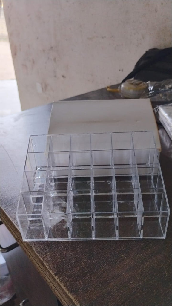 • Save your time and effort by keeping everything in one place with this great clear acrylic cosmetic stand. The top stand has been divided into 24 versatile compartments ideal for brushes, creams and lipsticks.