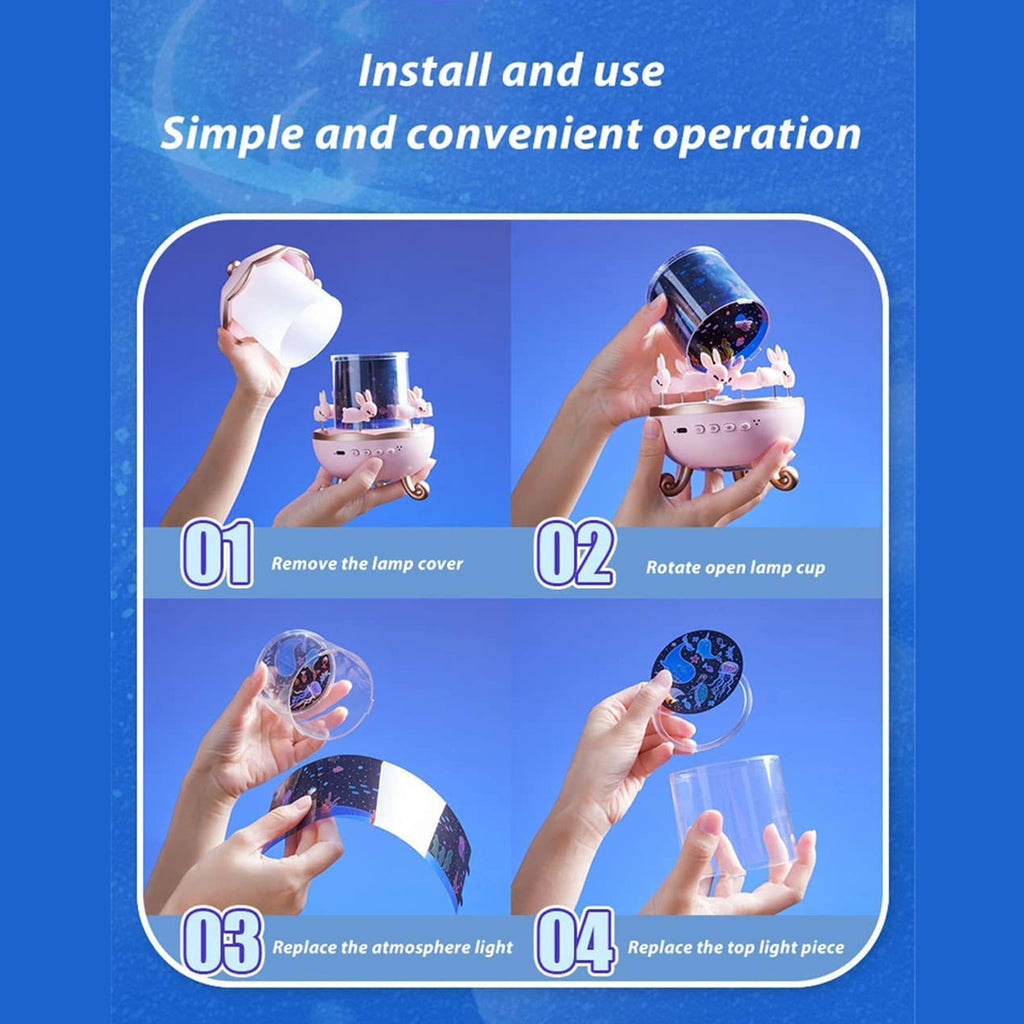 Transform your child’s room into a dreamy starry paradise with the Bunny’s Carousel Night Light Projector. This charming projector features adorable bunny figures rotating in a carousel, bathed in soft LED lights that create a mesmerizing sky full of stars and moons on walls and ceilings. night lamp, projection lamp, rotating lamp