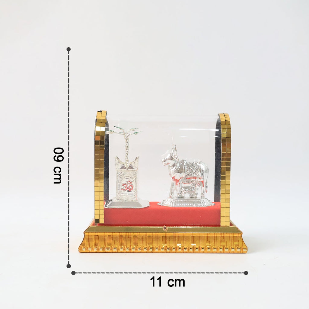 This exquisite decorative showpiece features a beautifully crafted silver-plated (the sacred bull) and with a symbolic tree, representing devotion, purity, and blessings. Intricately designed with fine detailing, the set is placed on a soft red velvet base and encased in a transparent acrylic cover with a golden border frame, ensuring protection from dust while enhancing its elegance. Ideal for pooja rooms, home décor, and auspicious gifting, this piece reflects spiritual significance and traditional artistry. Perfect for religious ceremonies, housewarming celebrations, or as a divine keepsake for loved ones.