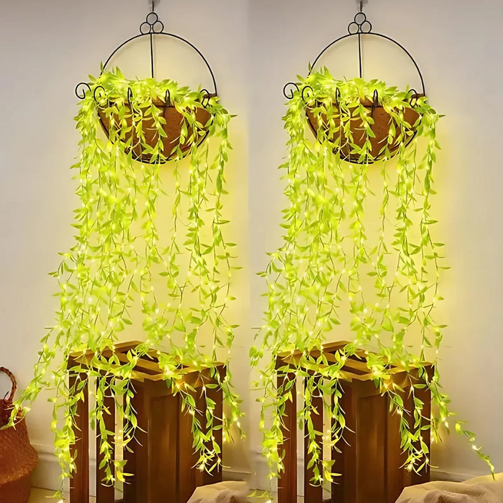 LED vine lights, decorative string lights, hanging lights, artificial vine lights, wall decor lights,home decoration,garden ambiance lighting,leaf vine string lights,green leaf fairy lights, plant-style LED lights,nature inspired lighting,Diwali decoration,Ganapati decoration