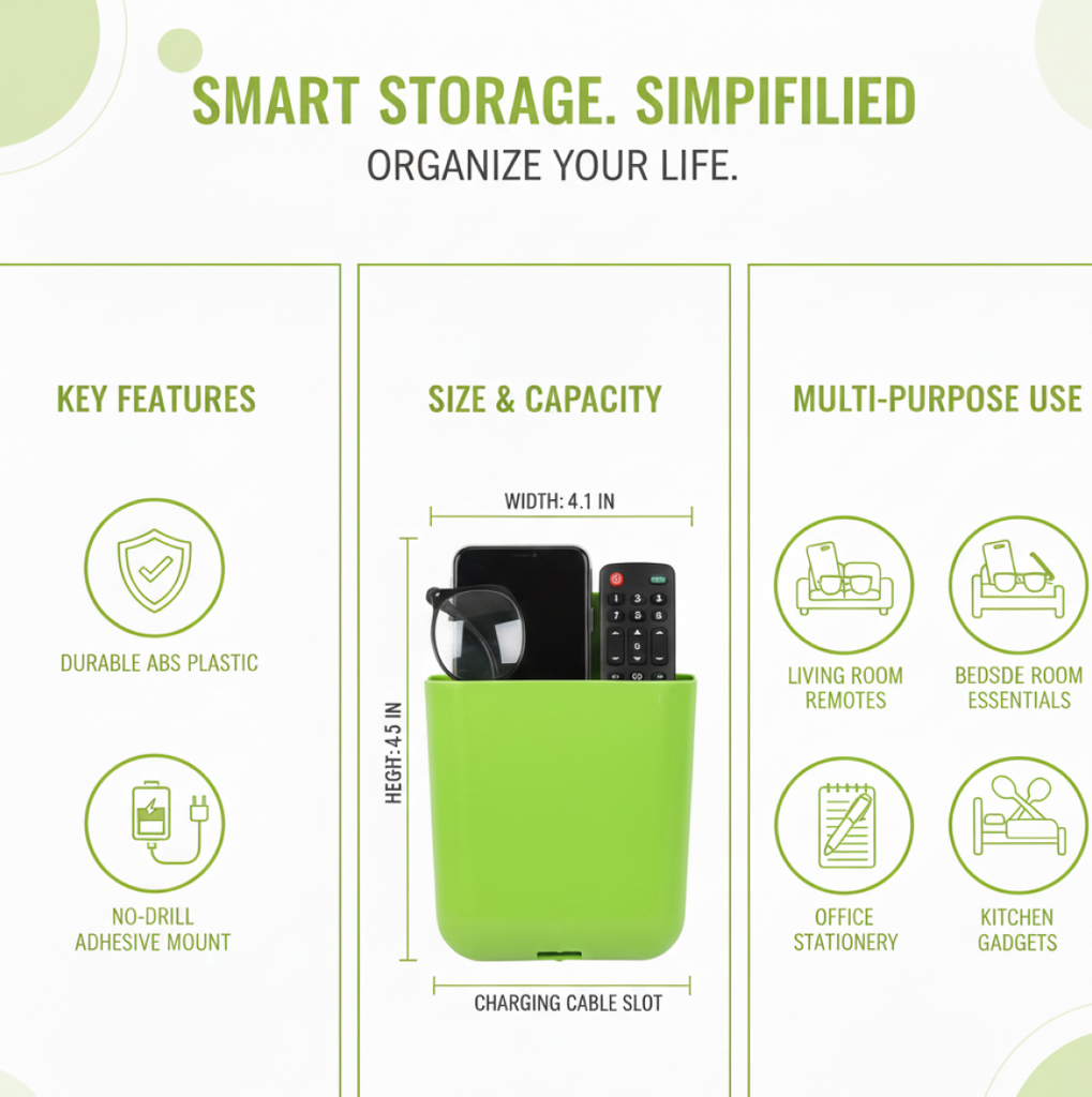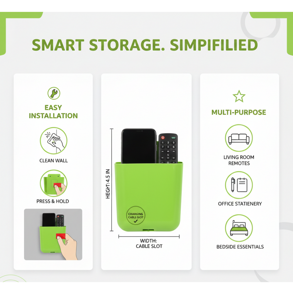 - Multipurpose Wall Holder: wall holders that can be used for various purposes, such as holding mobile phones, charging points, stationary items, bathroom accessories, remote controls, or makeup brushes.