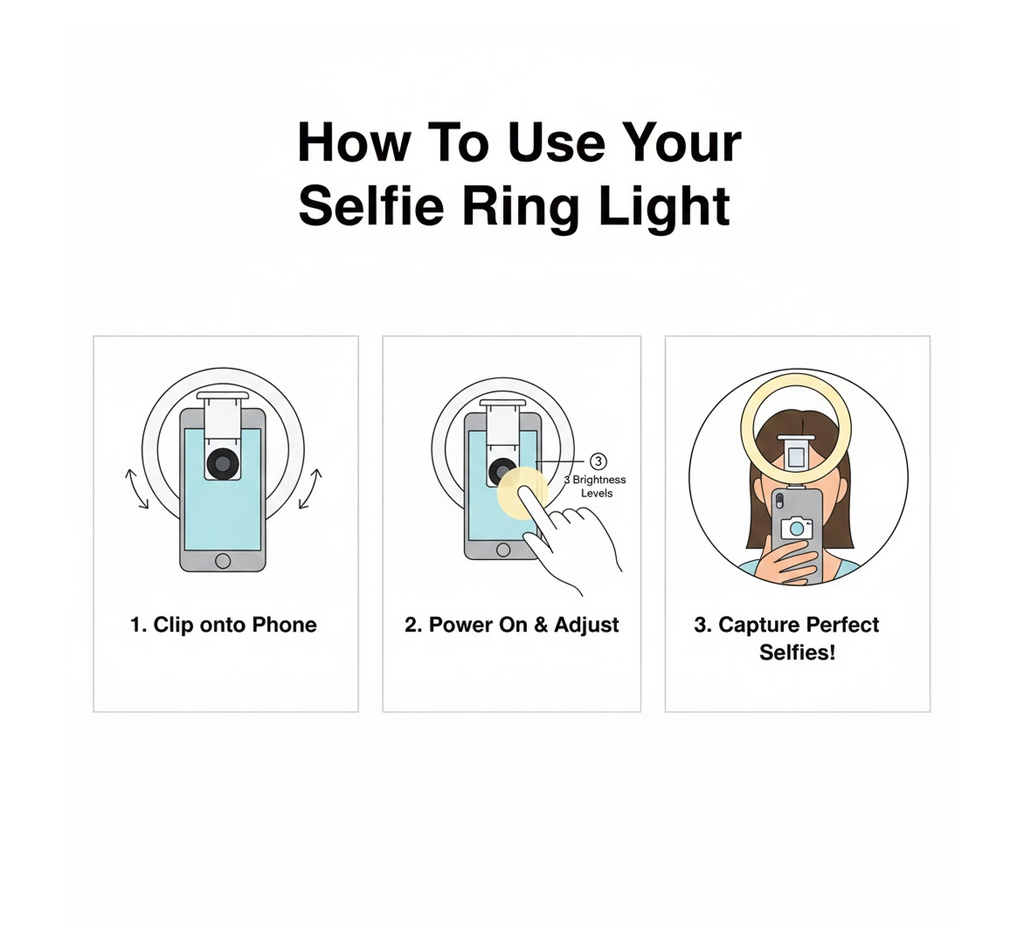 - Easy usage: enjoy your enhanced selfies. Clip the selfie ring on the phone and turn on the switch, choose the brightness you require.