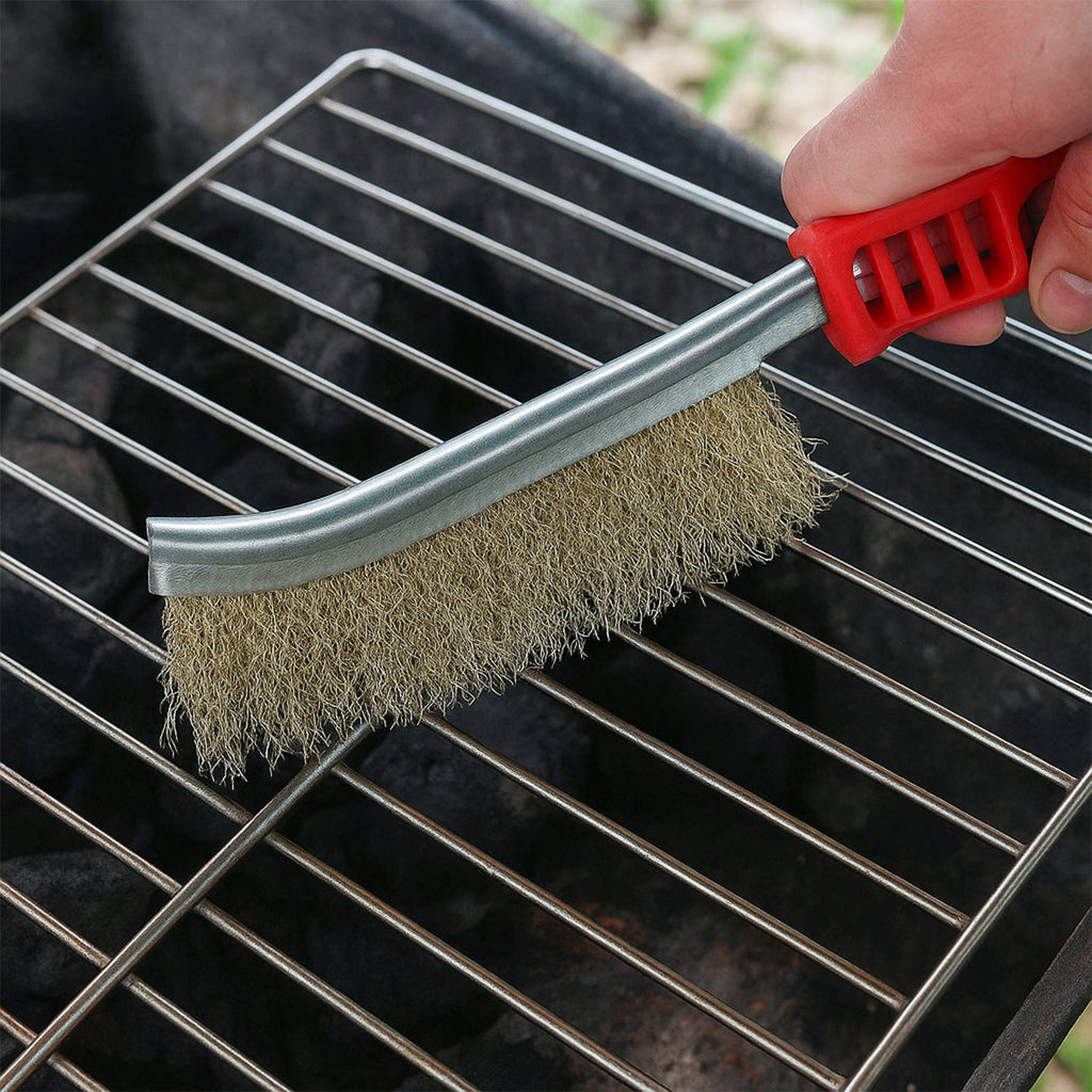 Curved Handle Brass plated steel Brush is a typical must-have utility tool in your kit. This tool is used for removing rust, paint, stubborn dirt and scales from various metallic and non-metallic surfaces whether it is a handrail to be painted or dusty spiral carpet. it provides more comfort and control over the removal of paint and rust from surfaces.