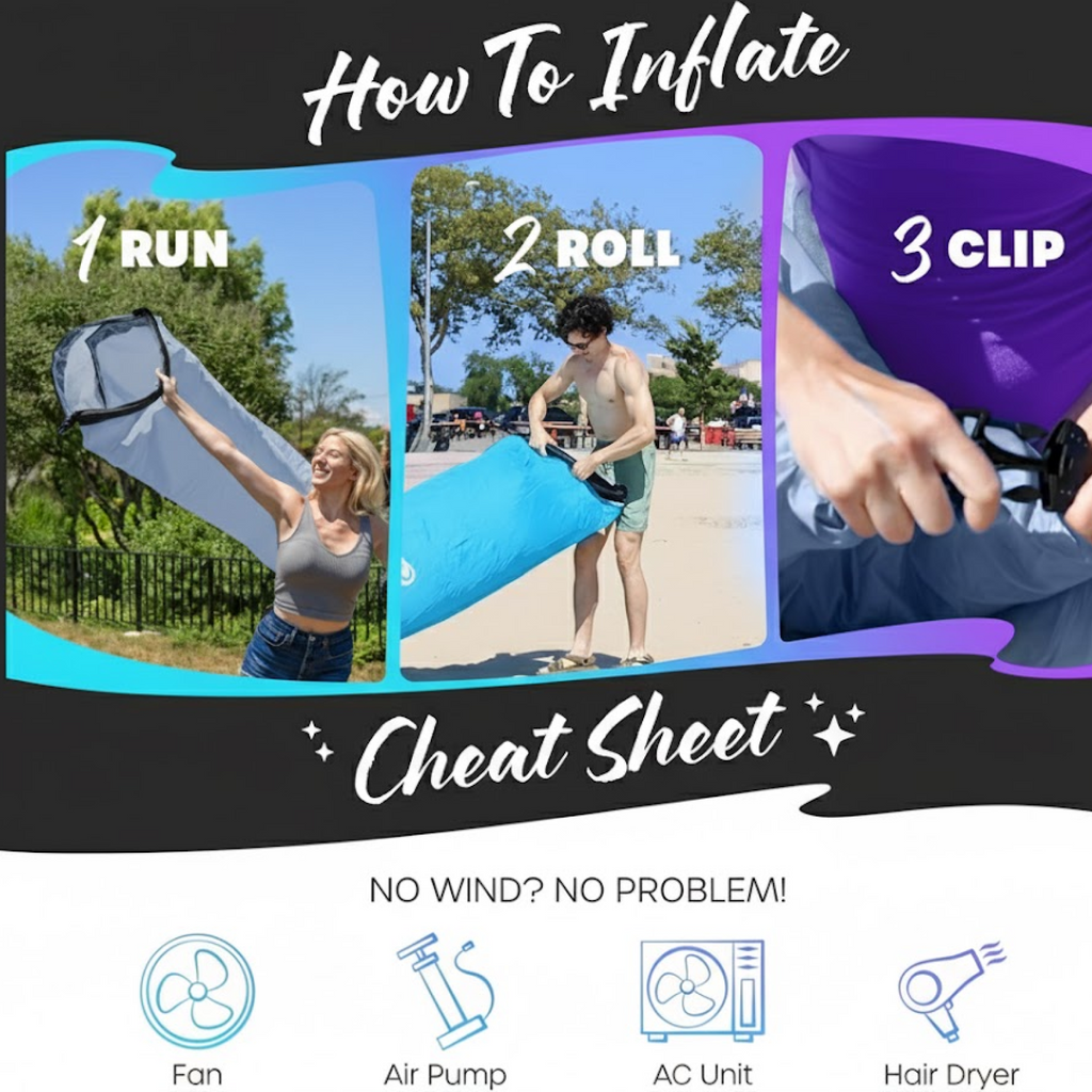•  Portable and perfect for outdoor & indoor With a carrying bag, specially suitable for camping hiking, beach swimming, outdoor BBQ, parks, backyard; You can use it as an inflatable bag, air hammock, air bean bags, cloud lounge, lazy bag, air filled lounger, etc.