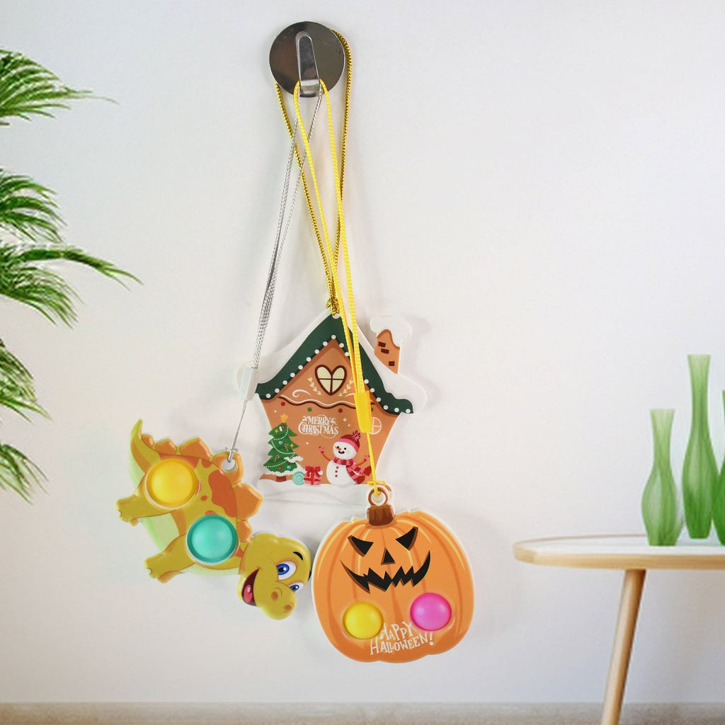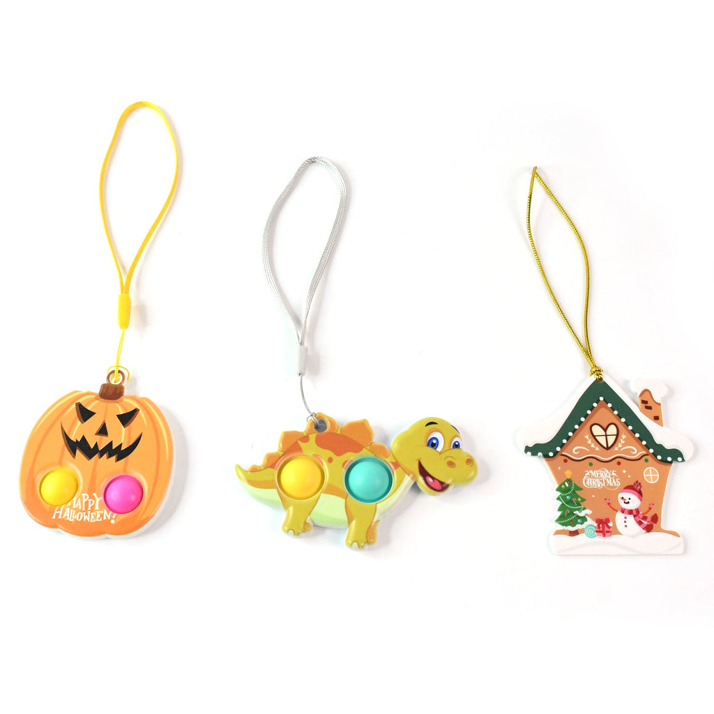 Delight kids and pop-toy lovers with this vibrant and festive push pop bubble keychain toy combo featuring three unique cartoon shapes – a Halloween pumpkin, a Merry Christmas snow house, and a smiling dinosaur. Made from safe, BPA-free silicone with a firm ABS base, each toy has popping bubbles for stress relief and sensory fun. These toys double up as quirky keychains or bag tags with their included loop straps, making them perfect for gifts, party favors, or everyday play. Enjoy both fun and function in one compact, lightweight toy that’s perfect on the go!